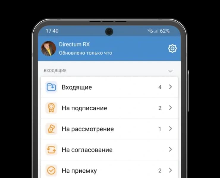 Вынесение резолюций, отправка и контроль поручений. Рассмотрение, согласование, рецензирование и подписание документов, создание документов из файла или с камеры.
