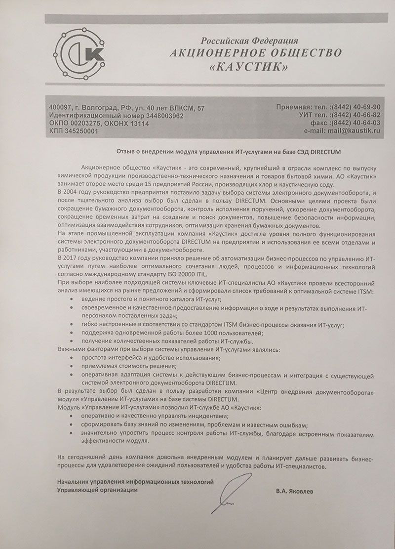 Модуль «Управление IT-услугами» позволил IT-службе АО «Каустик»: • оперативно и качественно управлять инцидентами; • сформировать базу знаний по изменениям, проблемам и известным ошибкам; • значительно упростить процесс контроля работы IT-службы, благодаря встроенным показателям эффективности модуля.